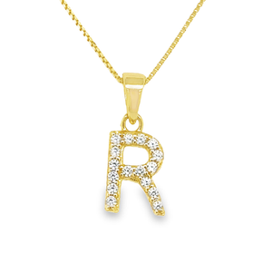 Yellow Gold Plated Sterling Silver Cubic Zirconia Letter R Pendant. This pendant is a stylish and personalized accessory that features the letter R in cubic zirconia stones. The pendant is made of sterling silver and plated with yellow gold for a luxurious look. The pendant comes with a matching silver chain that complements the pendant’s shine. This pendant is a great gift for yourself or someone who has the initial R in their name. It is a versatile piece that can be worn with any outfit and for any occasion.