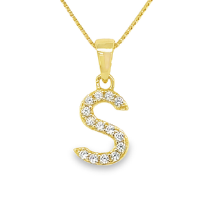Yellow Gold Plated Sterling Silver Cubic Zirconia Letter S Pendant. This pendant is a stylish and personalized accessory that features the letter S in cubic zirconia stones. The pendant is made of sterling silver and plated with yellow gold for a luxurious look. The pendant comes with a matching silver chain that complements the pendant’s shine. This pendant is a great gift for yourself or someone who has the initial S in their name. It is a versatile piece that can be worn with any outfit and for any occasion.