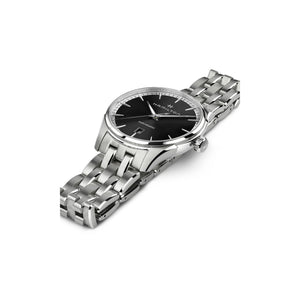 With a sophisticated design, the Jazzmaster Auto is a contemporary timepiece to suit your day from business time to night-out. Powered by an automatic movement that features a hairspring made from the new anti-magnetic alloy NivachronTM, this 40mm watch keeps precise time all week long. Stainless steel case and bracelet with a, black dial. Automatic movement. Case size 40mm. Water resistance upto 50 meters. Sapphire crystal. Folding clasp.