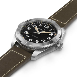 Gear up for the great outdoors with the Khaki Field Expedition, an all-terrain adventure watch with a compass design enabling you to navigate your adventure with the help of the sun. Housed in a 41mm stainless steel case paired with a green leather strap, it is equipped with a screw-down crown to protect the movement no matter the weather. Featuring a black textured dial with Super-LumiNova® coating for ultimate legibility, the Khaki Field Expedition is tough when you need it.