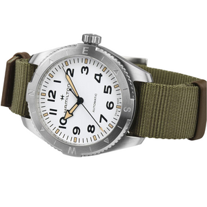Gearing up for the great outdoors just got easier, thanks to the Khaki Field Expedition and its new NATO Strap. An all-terrain adventure watch with a compass design, enabling you to navigate your next excursion with the help of the sun. Housed in a 41mm stainless steel case and paired with a green NATO textile strap, it is equipped with a screw-down crown and a white sandblasted dial, making it your toughest timepiece yet.