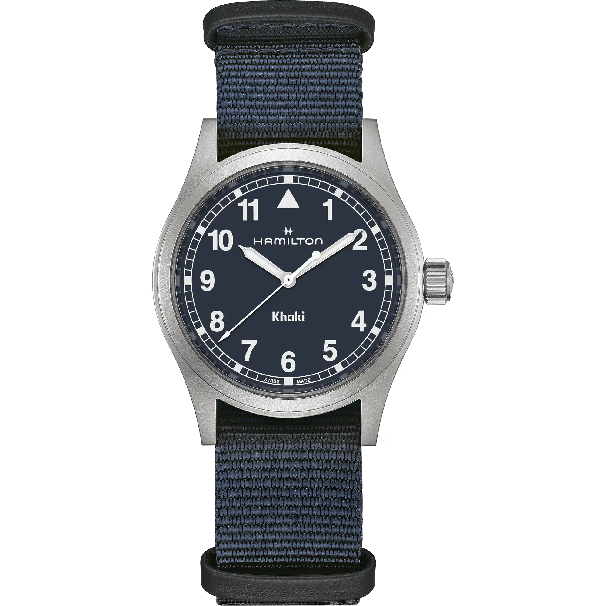The Khaki Field Quartz expresses a return to Hamilton's military heritage through simplicity in design. The dial features a clear typography with straighter Arabic numerals and a "railway" minute track. The color palette is understated, with its sleek blue dial highlighted by white Super-LumiNova® indexes. The watch comes with a blue textile NATO strap and blue leather loops - perfect for your next adventure out in the field.