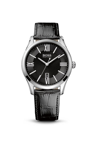 Crafted with a sleek croc-embossed leather strap, this boss watch also features a traditional round dial with stainless steel casing. A date window, roman numeral markers, and three-hand quartz movement complete this handsome timepiece. Stainless steel case measuring 43 mm, leather croc-embossed strap. Three-hand quartz movement. Black dial with date window display, roman numeral markers and logo detail. Water resistance to 3 ATM (100 feet).