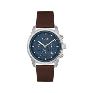 The focus and determination of every BOSS is mirrored in the bold design of the Trace, a sophisticated chronograph with date function. A super-matte blue dial contrasts with sunray sub eyes and light-reflecting polished indexes on the modern dial, while a raised tachymeter and two pushers add sporty detail. A crystal glass face extends to the stainless steel watch case, covering the tachymeter and adding an elevated finish to this architectural design. This watch features a brown leather strap that secures with a buckle clasp. Case size 44mm. Water resistance upto 50 meters. Mineral crystal.