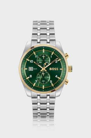 Boss Skytraveller chronograph quartz mens watch 1514195. Stainless steel case and bracelet with green dial. Quartz movement. Water resistance up to 50 meters. Mineral crystal. Case diameter 44 mm. Deployment clasp with push button.