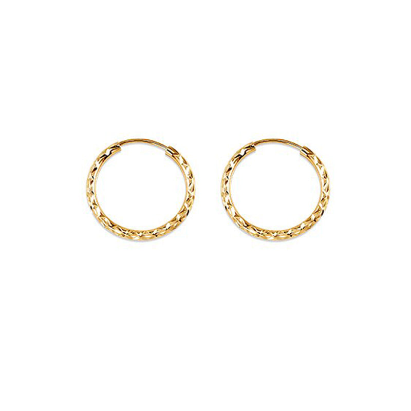 Add a touch of timeless elegance to your jewelry collection with these elegant 10K yellow gold hoop earrings. Measuring 15MM in diameter, these dazzling hoops feature intricate patterns that enhance their brilliance, catching the light with every movement. The polished gold finish exudes sophistication, making them a perfect accessory for both casual and formal occasions.