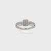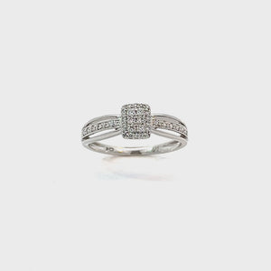 Exclusively hand crafted 10K white gold lab-grown diamond engagement ring featuring 0.18 total diamond weight. The ring showcases a rectangular cluster of round brilliant lab-grown diamonds at its center, encased in a delicate halo that enhances its sparkle. The split shank band is adorned with pave-set diamonds, adding dimension and brilliance to the design. This engagement ring embodies refined craftsmanship and modern elegance, offering a radiant symbol of love with ethical clarity.