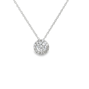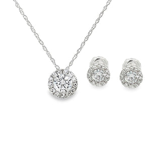 Exclusively handcrafted this 14K white gold jewelry set featuring a pair of stud earrings and a pendant necklace. This pendant showcases a round, brilliant-cut lab-grown diamond encircled by a halo of smaller diamonds, suspended from a delicate twisted chain. The matching earrings mirror the pendant's design, with each earring featuring a central diamond surrounded by a halo. Together, the set boasts a total diamond weight (TDW) of 1.00 carats, ensuring a dazzling sparkle with every movement. Perfect for special occasions or as an elegant addition to your everyday ensemble, this set combines timeless beauty with ethical and sustainable sourcing.