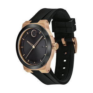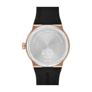 This mens movado bold watch features a round black toned dial with bronze tone hands and a movado dot at the 12 o'clock hour with date display at 3 o'clock in a 42mm bronze ion plated stainless steel case. Swiss quartz movement ensures accurate time keeping. This watch is water resistant to 30 meters and secures with a black silicone strap with buckle clasp.