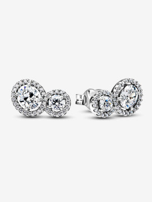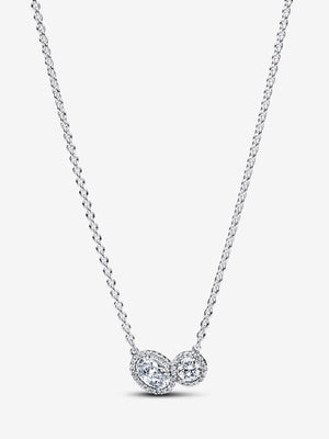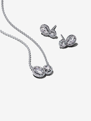 Celebrate the beauty of connection with the Double Halo Jewelry Gift Set. This sterling silver set features a collier necklace and matching stud earrings, each showcasing two sparkling stones—one round, one oval—embraced by a Pave halo. A symbol of two souls intertwined, this timeless set is a meaningful gift for someone special.