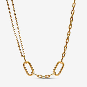 Your self-expression journey starts here: this 14k gold-plated Pandora ME Double Link Chain Necklace has endless styling possibilities to choose from, featuring two openable styling connectors - designed with grooved lines to set them apart - five links between each styling connector and a small carabiner clasp closure. Half of the necklace links up to a double chain detail, adding an individual edge to the chain. You can keep the original length, make your link chain longer or turn it into a choker, all by adding and taking away links to suit you. Once you’ve customized your link chain, remix it with meaningful medallions and mini dangles on the openable styling connectors to tell your story.