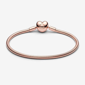 Make your story shine with the Pandora Moments Heart Clasp Snake Chain Bracelet. Our iconic snake chain bracelet gets a gleaming update in 14k rose gold plating, with a polished heart-shaped clasp. The clasp includes an engraved Pandora logo on one side and the Pandora Crown O logo on the other. Style this Pandora snake chain bracelet with up to 16 to 18 charms for an iconic everyday look that is all yours.