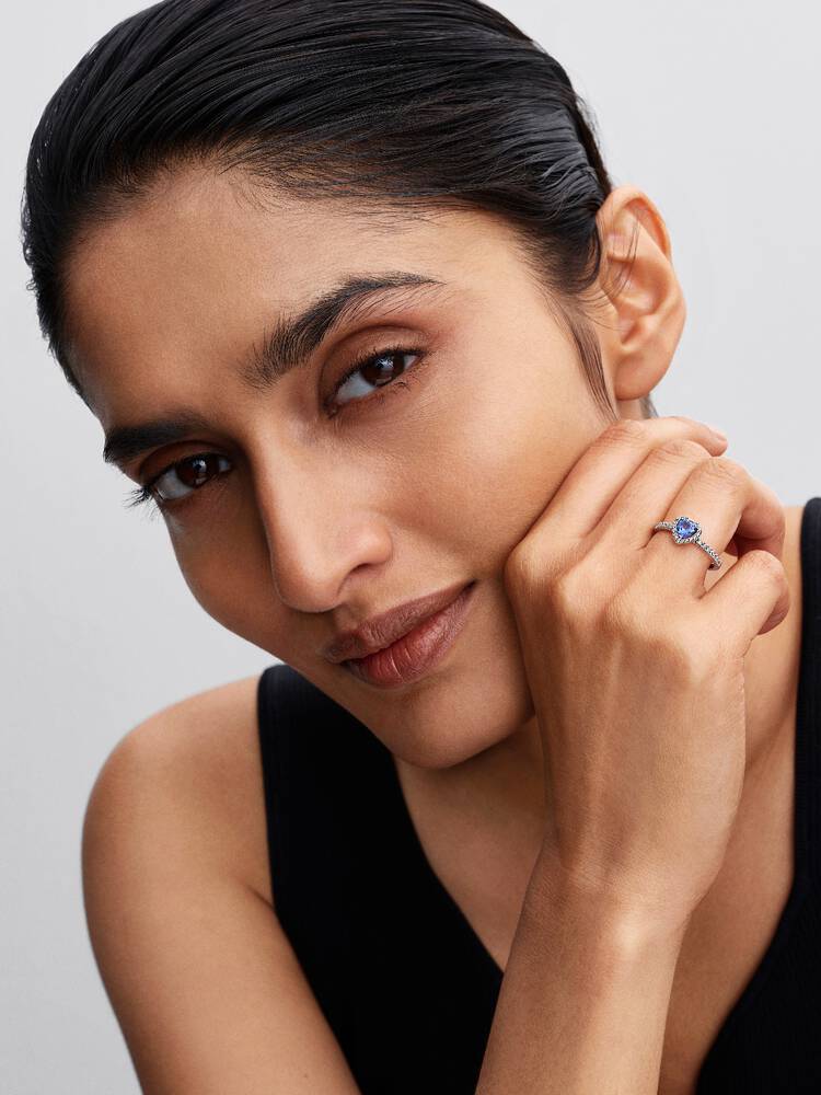 Make your heart beat faster. Featuring a blue, heart-shaped man-made crystal surrounded by a halo of pavé, wear this ring as a symbol of devotion and elegance, cut to perfection.
