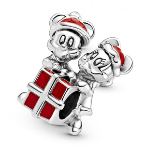 Make the holidays feel extra special with the Disney Mickey Mouse and Minnie Mouse Present Charm. Hand-finished in sterling silver, this design includes Disney’s Mickey Mouse and Minnie Mouse with grooved eyes and eyelashes to highlight their features. Mickey Mouse is wearing a scarf and holding Minnie on her shoulder. Both are wearing Christmas hats decorated in hand-applied red enamel that match the present they’re holding that includes a ribbon and bow. Featuring the Pandora and Disney logos on their backs, gift this piece to someone special to show you’re excited to spend the festive season with them.