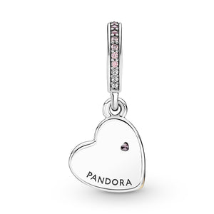 Double up on love for Mum with the Entwined Infinite Hearts Double Dangle Charm. A 14k rose gold-plated heart with pink man-made crystals glow next to a sterling silver heart, engraved with the words: "You are the heart of our family." The bail is accented with a pavé of pink and clear stones. The perfect gift for someone who always has a special place in your heart.