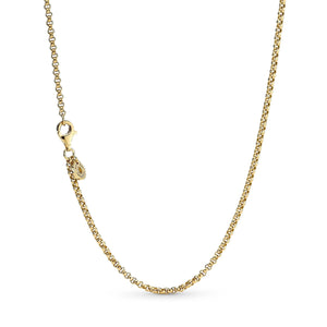 Discover a new way to wear your go-to charms with the Rolo Chain Necklace. Hand-finished and 14k gold-plated, this simple design is adjustable to three different lengths. This piece can only be worn with small and medium-sized Pandora O Pendants. Attach a pendant with a sparkling bail clasp to make a statement. Team with 14k gold-plated earrings decorated with stones for a uniform look with added shine.