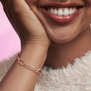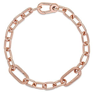 Link what you love like never before. Crafted from a 14k rose gold-plated unique metal blend, the Pandora ME Link Chain Bracelet holds endless styling possibilities. The design features two openable connectors - designed with grooved surfaces to set them apart - a group of four links between each styling connector and a carabiner clasp closure. First, customise your link chain. Four links can be swapped out for one styling double link or one styling link - keep the original length or adjust it to suit you. Once you’ve curated your link chain, style up to one medallion per link, two meaningful medallions or up to eight mini dangles on each openable connector to show the world who you are.