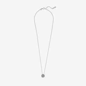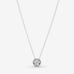 Welcome the holidays with the Sparkling Snowflake Collier Necklace. Hand-finished in sterling silver, this piece is inspired by the wonders of winter. The necklace features clear stones in the form of a star-like snowflake formation inside a circle decorated with clear cubic zirconia. One pear-shaped stone dangles from the end of the chain and a Pandora crown O monogram logo tag features by the clasp. Adjust to suit your style and wear with other shimmering pieces for a statement look.
