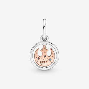 Celebrate the Force with this Star Wars Rebel Alliance Symbol Spinning Pendant. Designed in a two-tone metal finish, this spinning pendant features the Rebel Alliance logo, with three round cubic zirconia set into the front of the logo and the word "REBEL" engraved onto the back of the charm. Show your allegiance everywhere you go or gift it to the Star Wars fan in your life.