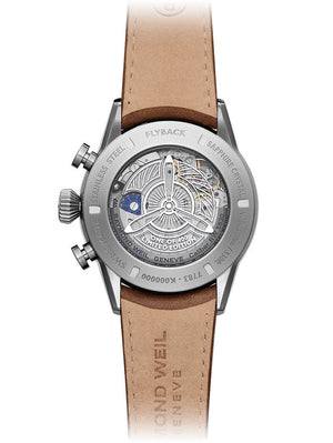 The freelancer Pilot Flyback Chronograph Limited Edition “One of 400” celebrates the Brand’s heritage by paying tribute to Mr. Raymond Weil’s passion for aviation. This timepiece also features a new and intricate complication for the Brand, the flyback chronograph. Used by many pilots, the flyback function allows the precise calculation of distances during air navigation. To enhance its elegant and adventurous look, the 42mm stainless steel case is fully brushed and has a grey PVD coating. The hands and numerals are lined with Super-LumiNova®, aiding readability in restricted light. Functional and playful, its colors and design are an ode to aviation in the 20th century, a time when Mr. Raymond Weil himself enjoyed flying. With the tarmac-like outer ring and propeller-like concentric circles on the counters, the finishings throughout the dial further evoke the world of aviation. The automatic movement inside the timepiece is the RW5530, a flyback chronograph movement that allows a simultaneous reset and restart of the chronograph with a single pusher and has a 56h power reserve. The yellow hands, at the central position and in the right counter, will display the elapsed time in flight. The freelancer Pilot Flyback Chronograph also features an onion-shaped crown, a design standard on pilot watches. The W-shaped oscillating weight and blued column wheel are visible through the “propeller” engraved sapphire case back. The brown genuine calf leather strap has four rivets, reminiscent of those found on airplanes, and a double push-security folding clasp. Launched in 2007, the freelancer collection was created in honor of the free-spirited man who wishes to remain in control of his own destiny, and features an eclectic mix of urbane mechanical watches. The freelancer mixes classic and modest to create a harmonious and unique design. Constantly reinterpreting itself and free from all constraints, the freelancer conserves those elements which constitute its strengths.