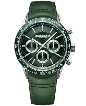 RAYMOND WEIL is pleased to unveil the freelancer 7741, a tri-compax chronograph brimming with elegance.The 43.5mm stainless steel case encompasses a combination of brushed and polished surfaces, imbuing the watch with a sumptuous appearance. Both the hands and indexes are lined with luminescent treatment, aiding readability in restricted light. The bezel features a scratch-resistant ceramic inlay, marked with a tachymeter scale, contributing to the refined and luxurious feel. On this model, the 30-minute and 12-hour chronograph registers are equipped with highly legible white hands, while all three counters are framed with silver-toned circlets. The hour track is snailed, adding a delightful texture to the display and the dial is slightly smoked, contributing to the model’s handsome appearance.At the heart of the new freelancer Chronograph 7741 sits the new Calibre RW5030. Visible through the exhibition case back, this automatic movement has a power reserve of 56 hours. Offered in different dial variants, the model is available with a 5-rows bracelet or a color-coordinated strap. water resistance upto 100 meters.