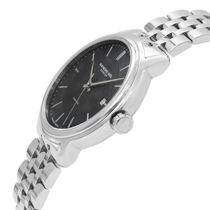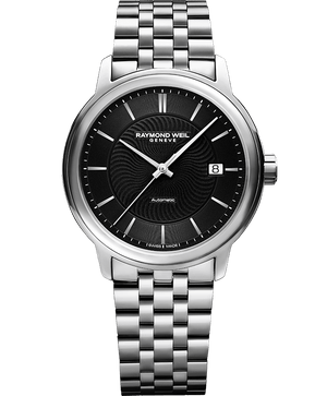 Raymond Weil stainless steel case with a stainless steel bracelet. Black dial with silver-tone hands and index hour markers. Minute markers around the outer rim. Automatic movement with a 38-hour power reserve. Scratch resistant sapphire crystal. Transparent case back. Case size 42 mm. Fold over clasp with a push button release. Water resistant at 50 meters.