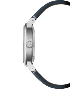 The implementation of the moon phase, an emblematic watchmaking function, heralds a new face of creative elegance for RAYMOND WEIL. The denim blue dial, located beneath a vintage-inspired sapphire crystal glass-box, has been refined to the highest degree. The hours and minutes are eloquently conveyed with silver-toned hands, lined with Super-LumiNova®. The sector dial presents the hours, minutes and seconds periods on discrete tracks, augmenting readability. A closer inspection of the dial reveals contrasting finishes, the hour track is smooth, the minute track is snailed and the central area of the dial is adorned with a delicate vertical brush. The bezel is decorated with a vertical satin-brush that contrasts wonderfully with the highly polished bevel nearby. This juxtaposition of two finishes reinforces the overall level of finishing. The 35mm millesime moon phase marks a fresh take on this iconic horological function: with its visually striking, sectorized dial, this model offers a reading of the lunar phases that is both dynamic and intuitive. The lugs are adorned with 16 laboratory-grown diamonds (0.26 cts), providing a discreet sparkle that blends quintessential femininity with modern sensuality. A sapphire caseback affords sight of the self-winding movement within and the “W-shaped” oscillating weight, RAYMOND WEIL’s horological signature. The navy blue genuine calf leather strap is enhanced with a unique W-stitched detail. As the name suggests, the collection is a grand vintage interpretation of the RAYMOND WEIL brand.