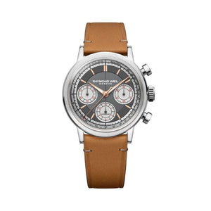The millesime Tri-Compax Chronograph blends timeless design with modern elegance. Every detail of the millesime Tri-Compax Chronograph contributes to mechanical brilliance. Housed in a vintage-inspired sapphire crystal glass-box, the bezel contributes to the refined and luxurious feel of the timepiece. The anthracite sector dial is enhanced with a snailed minute track and the central area of the dial is adorned with a delicate vertical brush. Both the hands and indexes are lined with luminescent treatment, aiding readability in restricted light. A tachymeter scale surrounds the anthracite sector dial, adding a sporty, dynamic touch. This chronograph evokes elegant athleticism with three silver counters, accented by Super-Luminova® indexes. The 39mm stainless steel case encompasses a combination of smooth and snailed contrasting finishes and is attached to a camel genuine calf leather strap. At the heart of the millesime tri-compax chronograph sits the RW5030 mechanical chronograph self-winding movement. Visible through the exhibition case back, this automatic movement has a power reserve of 62-hours, ensuring accuracy and reliability for all of your adventures. As the name suggests, the millesime collection is a grand vintage interpretation of the RAYMOND WEIL brand. This collection pays homage to the rich heritage and traditions of horology while celebrating the simplicity of refined design. The brand has naturally delved into the past, creating timepieces that offer period charm combined with present-day practicality. The result is a symphony of complex details that captivates watch enthusiasts and connoisseurs alike.