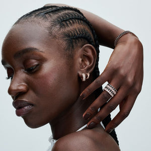 Indulge in timeless elegance with the Black Sparkling Row Eternity Ring from Pandora. Crafted in sterling silver and plated with 14k rose gold, this ring features 19 black man-made crystals. The eternity row design allows the sides of the stones to peek through, offering a modern twist. Functional holes on the inside of the band add versatility. Embrace new stacking possibilities with a balance of modern aesthetics and classic charm with this Pandora Timeless piece.
