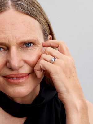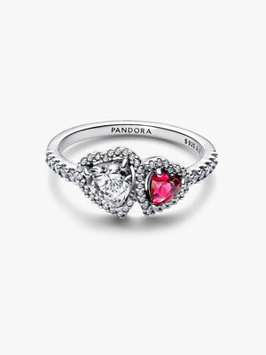 This sterling silver ring features two heart-shaped stones, one clear and one vibrant red, connected by a halo of shimmering Pave. With extra sparkle along the band, it's an eye-catching symbol of love and connection.