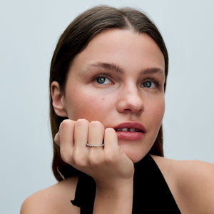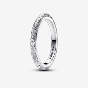 It's all in the details with the Pandora ME Texture & Stones Ring. A sterling silver band with a D-shaped profile is punctuated by six triangular punctures, each featuring a stone sparkling from within the tiny crevice. The rest of the ring's band is embellished with a textured pattern. Inspired by the appearance of sand and the pattern of glistening sun on the ocean, this delicate, detailed ring is a subtle way to make a statement.
