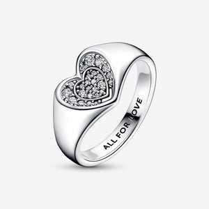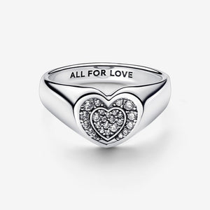 Channel the vibrant energy of love with our Radiant Heart Pave Signet Ring. This ring features a concave, multidimensional heart design, accented with sparkling pave and hand-finished in sterling silver. "ALL FOR LOVE" is engraved in the inside of the band as a sweet reminder of the power of two hearts joining together.