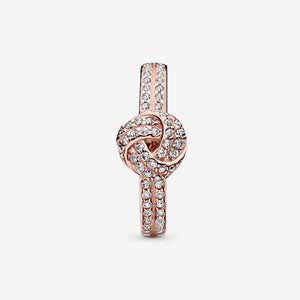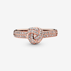 The love knot is an enduring symbol of unbreakable bonds. This Pandora Rose (14k rose gold-plated unique metal blend) and cubic zirconia ring is a timeless addition to any jewellery collection. The classic love knot design is created with two rows of glittering stones that continue down the band. Wear it solo as a statement or stack with similar styles for a personal look.