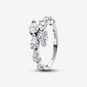 Wrap yourself in sparkling style with the Sparkling Overlapping Band Ring. This sterling silver ring features four pear-shaped stones on each overlapping end. V-shaped prongs at the tip of each stone emphasise the pear shape, while claw-shaped prongs at the wide end of the stone keep it secure. Sleek, stylish and striking, this asymmetrical ring is a fresh twist on a classic design and makes a stunning addition to any look.