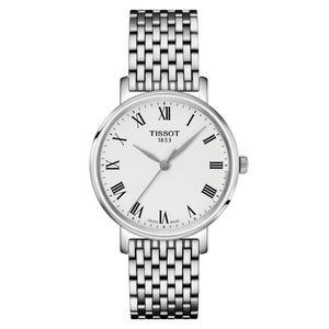 Tissot Everytime Quartz Women's Watch T1432101103300. Stainless steel case and bracelet with silver dial, quartz movement. Case size 34mm. Water resistance up to 50 meters. Scratch-resistant sapphire crystal. Interchangeable quick release bracelet, Butterfly clasp with push-buttons.