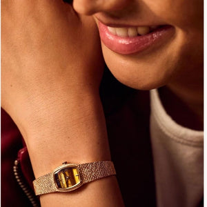 Step back in time to the glitz and glam of the 1970s with the Bulova women’s Classic “Goddess of Time” watch. Borrowing the timeless design of vintage Bulova “Goddess of Time” watches, the rose gold-tone stainless steel tonneau case has a textured top and a brightly polished bezel, seamlessly transitioning to a textured mesh bracelet. Each striated brown genuine tiger eye dial is completely unique and is appointed with rose gold-tone applied markers and matching hands, while Bulova’s Goddess of Time herself is etched onto the case back in intricate definition. Feel truly divine in this stunning Bulova ladies’ timepiece. Embrace a refined elegance with this impressive Bulova women’s timepiece from the Sutton collection. Distinguished by a silver-tone stainless steel rectangular case, the watch features a mineral crystal and a finishing that looks flawless with any wardrobe. The radiant salmon dial is accented with applied silver-tone numerals and hands for a look of true sophistication. A matching five-link two-tone stainless steel bracelet features a deployment closure with pushers for a perfect fit and latched spring bars for easy release. Experience an elevated sense of luxury with this Bulova ladies’ timepiece for the woman with an exceptional sense of style.