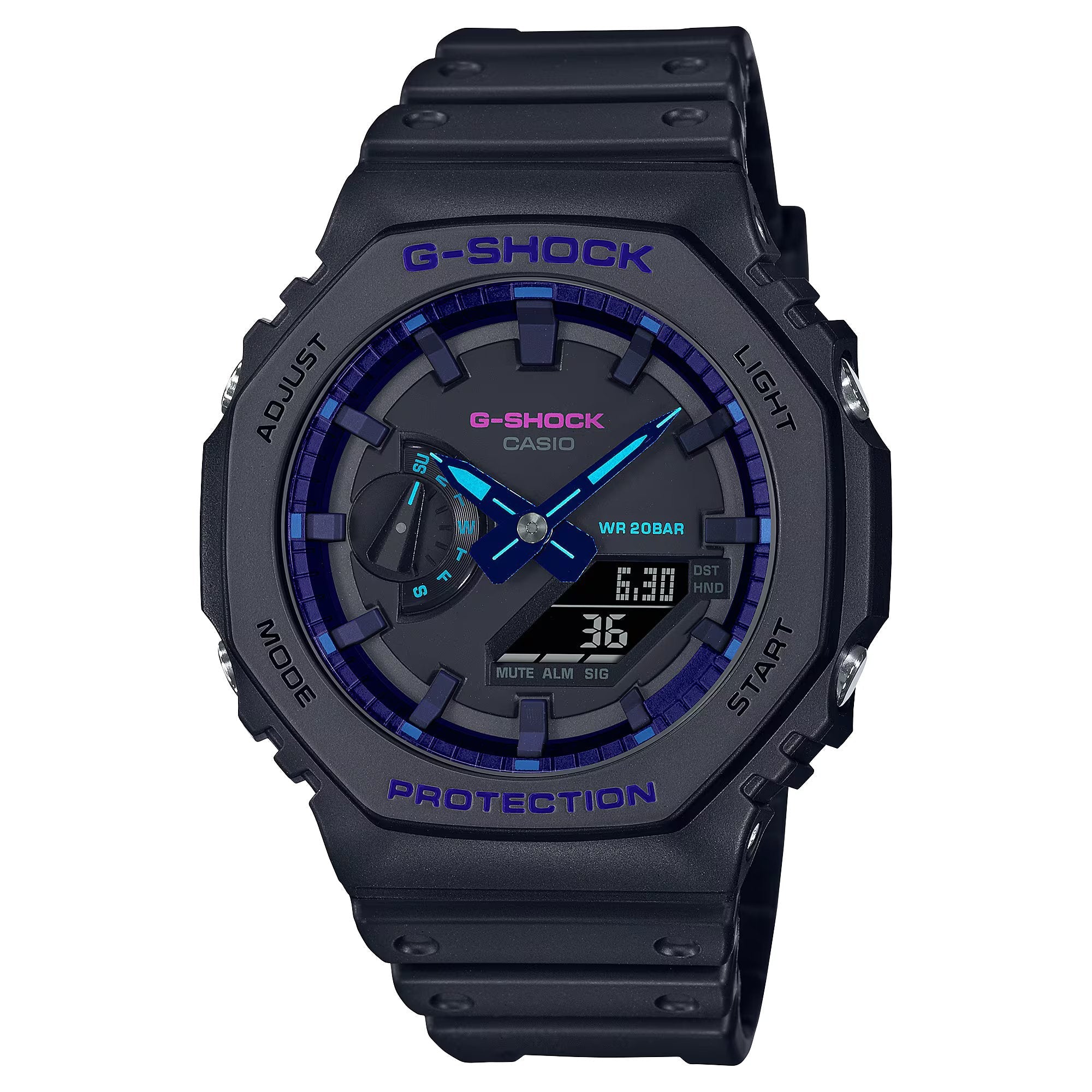 The analog-digital GA2100VB-1A takes a dive into the world of virtual reality. The basic black coloring of the watch is accented by blue violet, which creates a futuristic atmosphere of virtual reality for the GA2100 with octagonal bezel.