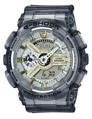 A metallic shine with a modern twist, the new GMAS110GS is slightly smaller for a refined fit on slimmer wrists. This compact design is based on the popular GA110 and brings metallic translucence to the ever-popular analog-digital G-SHOCK design. Gray semi-transparent resin is combined with dial components in matte and mirrored gold tones for balanced, fluid, contemporary style. The GMAS110GS-8A is the perfect fit for fashionable, trend-setting youths. Accuracy: ±15 seconds per month. Approx. battery life: 1 Year on CR1220. Size of case : 49 x 45.9 x 15.8mm. Case / bezel material: Resin. Resin Band. Neobrite. Magnetic Resistant. Shock Resistant. Mineral Glass. 200-meter water resistance.