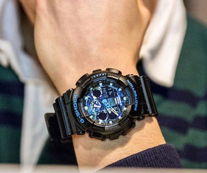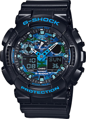 Black resin case with a black resin strap. Fixed bezel. Black Analog-digital dial with blue hands and index hour markers. Dial Type: Analog-digital. Quartz movement. Scratch resistant mineral crystal. Solid case back. Case dimensions: 55 mm x 51.2 mm. Case thickness: 16.9 mm. Round case shape. Tang clasp. Water resistant at 200 meters / 660 feet. Functions: date, day, hour, minute, second, shock and magnetic resistant, auto led light, world time, 4 daily alarms with 1 snooze alarm, hourly time signal, 1/1000 second stopwatch, countdown timer, full auto-calendar. Sport watch style. Casio G-Shock Men's Analog-Digital Watch GA100CB-1A.