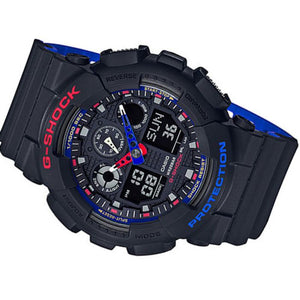 G-Shock's popular GA-100 analog/digital hybrid, now with special colorway. Comes in a black base with bezel markings, index, and hands accented with red, white, and blue tri-coloring. Also features bi-color molded bands with a black outer surface and a blue inner surface that reveals itself whenever the watch is strapped onto or wear on the wrist. Resin band, high intensity Super Illuminator LED, digital display area, alarm alerts, alarm function. 200-meter water resistance. Size of case : 55 x 51.2 x 16.9mm.