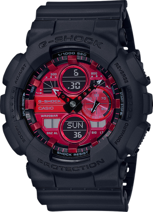G-SHOCK announces new red color that exudes high energy. Base mode is the original square face GA140. The basic black of these models is offset by bright red colors for looks that are tough and that go well with today's street fashions. Case / bezel material: resin. Resin band. Magnetic resistant. Shock resistant, mineral glass. Size of case : 55 x 51.2 x 16.9mm. 200-meter water resistance. LED light. Auto light switch, selectable illumination duration (1.5 seconds or 3 seconds), afterglow. World time, 1/1000-second stopwatch. Measuring modes: Elapsed time, lap time, split time. Others: Speed (0 to 1998 units/hour), Distance input (0.0 to 99.9). Mach indicator (speed exceeding 1225 units/hour). Countdown timer. Measuring unit: 1 second. Countdown range: 24 hours. Countdown start time setting range: 1 minute to 24 hours (1-minute increments and 1-hour increments). Other: Auto-repeat, 5 daily alarms (with 1 snooze alarm). Hourly time signal. Full auto-calendar (to year 2099). 12/24-hour format. Regular timekeeping. Analog: 2 hands (hour, minute (hand moves every 20 seconds)), 1 dial (speed). Digital: Hour, minute, second, pm, month, date, day.