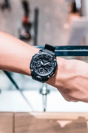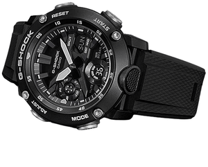 G-SHOCK, the watch brand that is constantly setting new standards for unmatched timekeeping toughness, comes a new series of GA2000 timepieces that are destined to become the next-generation standard of the G-SHOCK world. This GA2000S model are available in black (GA2000S-1A) coloring, with simple highlight colors that accent the forms of these watches. A multidimensional face, a big front button, and other design elements create a powerful and tough design. Shock resistant, mineral Glass, neobrite. Case / bezel material: carbon / resin. Resin band. Size of case: 51.2 x 48.7 x 14.1mm. 200-meter water resistance. Double LED light. LED light for the face (Super illuminator, selectable illumination duration (1.5 seconds or 3 seconds), afterglow). LED backlight for the digital display (Super illuminator, selectable illumination duration (1.5 seconds or 3 seconds), afterglow). World time, 1/100-second stopwatch. Countdown timer. Countdown range: 24 hours. Measuring unit: 1/100 second (for the first 60 minutes), 1 second (after 60 minutes). Measuring modes: elapsed time, split time, 1st-2nd place times. Measuring unit: 1 second. 5 daily alarms, hourly time signal. Full auto-calendar (to year 2099). 12/24-hour format. Button operation tone on/off. Regular timekeeping. Analog: 2 hands (hour, minute (hand moves every 20 seconds)), 1 dial (mode). Digital: Hour, minute, second, pm, month, date, day. LED:White.