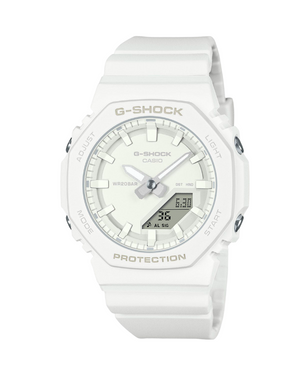 Enjoy the ever-popular digital analog G-SHOCK look with a fit more comfortable than ever. The GMA-P2100 takes the already compact GMA-S2100 design and makes it even slimmer and more compact, with a shorter band length, as well, to fit smaller wrists with total comfort. Monochromatic finishes in vibrant colors — dynamic turquoise blue (new color), bright pink, and classic white — lift the spirit, and the 9 o’clock inset dial from the original GMA-S2100 is left behind for a streamlined, minimalist look. The stylish, yet practical watch face features a dial, logo, index marks, hands, and other components finished in different shades of the same color, simultaneously projecting sophistication and ensuring an easy read. The bezel and band of these watches are made with bio-based resin produced from renewable organic resources, a material expected to help curb CO2 emissions and otherwise reduce environmental impact.