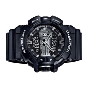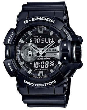 Black resin case with a black resin strap. Fixed bezel. Black dial with silver-tone hands and index hour markers. Minute markers around the outer rim. Dial Type: Analog-digital. Quartz movement. Scratch resistant mineral crystal. Case size: 55 mm 51.9 mm. Case thickness: 18.3 mm. Round case shape. Tang clasp. Water resistant at 200 meters / 660 feet. Functions: hour, minute, second, led light, world time (31 time zones), 1/100 second stopwatch, countdown timer, 5 daily alarms, hourly time signal, full auto calendar. Additional Info: shock resistant, magnetic resistant. Sport watch style. Casio G-Shock Black Dial Resin Men's Watch GA-400GB-1ACR.