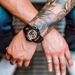 From G-SHOCK, the watch brand that is constantly setting new standards for timekeeping toughness, come new models with garish coloring. The base model is the GA-700, which uses original resin molding technology that makes it possible to form analog hands, dial, and hour markers of resin that shines like metal. This lineup create the image of the accessories or fashion items worn by b-boys. The black and gold model has an overall shiny finish for a tough and energetic look. Super Illuminator. Stopwatch with Target Time alarm. Hand shift feature. Metal (stainless steel) used for large front button. 200-meter water resistance. Size of case : 57.5 x 53.4 x 18.4mm.