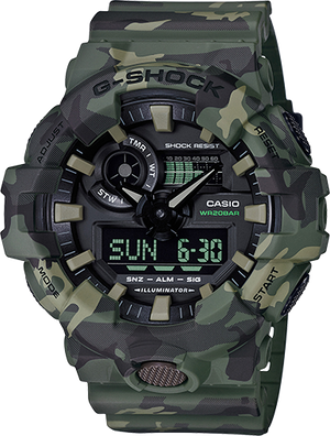 Find a modern detail to give your look a rugged edge with this G-Shock® watch. Stainless steel case. Camouflage-patterned, resin strap with adjustable buckle closure. Round face. Shock resistant. Dial features Super illuminator high-brightness LED backlight. Features stopwatch with target time alarm. Water resistant up to 200 meters. Display case included. Imported. Measurements: Case Height: 51 mm Case Width: 51 mm Case Depth: 16 mm Band Width: 24 mm.