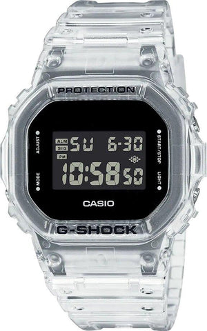 The digital standard square DW5600SKE-7 of the new TRANSPARENT PACK Series timepieces are created using semi-transparent resin parts. Everything about this white-based model makes it the perfect choice as an attractive fashion item. Case / bezel material: resin, resin band. Size of case : 48.9 x 42.8 x 13.4mm. Shock resistant. Mineral glass. 200-meter water resistance. Electro-luminescent backlight.