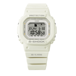 G-Lide GLXS5600-7B Watch. Soak up the sun and get to the beach with a G-LIDE watch in natural colors perfect for any surf scene. The GLX-S5600, a slightly smaller take on the G-LIDE base model, takes on earthy colors and a beach-kissed design, recalling surfing trips that evoke a feeling of oneness with nature. The hairline-finished metal components on the face represent waves and are set against a light blue or white body inspired by beautiful beaches. Handy functions that every surfer needs like tide graphs and moon data are delivered straight to your wrist, ready to ride the waves anywhere in the world. Nature is front and center with key resin components in the bezel and band made with bio-based resin. Produced using renewable organic resources, this material is expected to help reduce environmental impact.