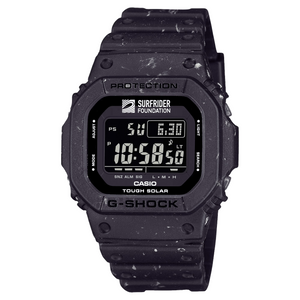 Ocean lovers and wave riders take note! Introducing the G-SHOCK-Surfrider Foundation collaboration for the world’s top surfers and extreme sports fans. Sharing a passion for the environment, G-SHOCK is proud to collaborate with the Surfrider Foundation, which works together with surfers committed to the ocean to protect the marine environment. Equipped with Tough Solar to charge the watch from sunlight, the G5600 boasts a bezel and band made of recycled urethane, reducing the environmental impact of resin scraps that would otherwise be discarded. With the unique and distinctive flake pattern that comes from mixing reused white scrap resin into a black base, this special collaboration does it all with style.