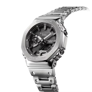 Metal Elegance: Silver Full-Metal G-SHOCK GMB2100D-1A Watch. Elegance expressed in forged steel beating with the heart of G-SHOCK’s water and shock resistance: that’s the GMB2100D-1A. The silver full-metal construction undergirds an array of performance tech and radiates sophistication. The polished metal offsets the vapor deposition finish of the black dial, demanding equal attention between the metal bezel and the detail of the dark watch face. The full-metal GMB2100D-1A is a powerhouse of performance, style, and durability. The G-SHOCK GA2100 series was released in 2019, and the popularity of the series has spawned innovative iterations. The Full Metal GMB2100 series is one such iteration, conceiving the GA2100 as a full-metal construction. But the innovation isn’t only aesthetic. We upped the ante by including Tough Solar charging and Bluetooth connectivity. How does one create a full-metal watch and yet offer shock resistance? We crafted resin buffer components between the metal elements to ensure the GMB2100D-1A lives up to the G-SHOCK standard in shock protection. Stainless steel ensures the watch is resistant to corrosion, and the protection features are rounded out with 200m water resistance (wr 20 bar). That’s G-SHOCK. Explore other full-metal colorways: the black GMB2100BD-1A, or the rose-gold GMB2100GD-5A.